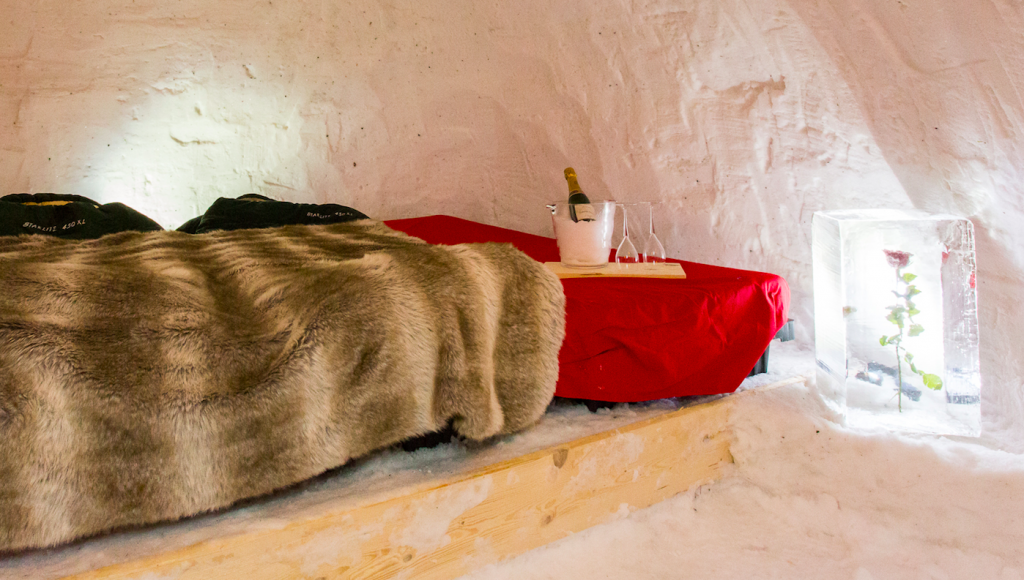 Repas* dans un igloo destiné à la restauration puis nuit dans un autre igloo aménagé en dortoir pour 5 personnes maximum. Les gens venant à moins de 5 personnes, sont susceptibles de ne pas être seuls dans l’igloo et sont également susceptibles d’être séparés dans plusieurs igloos selon le remplissage du village.